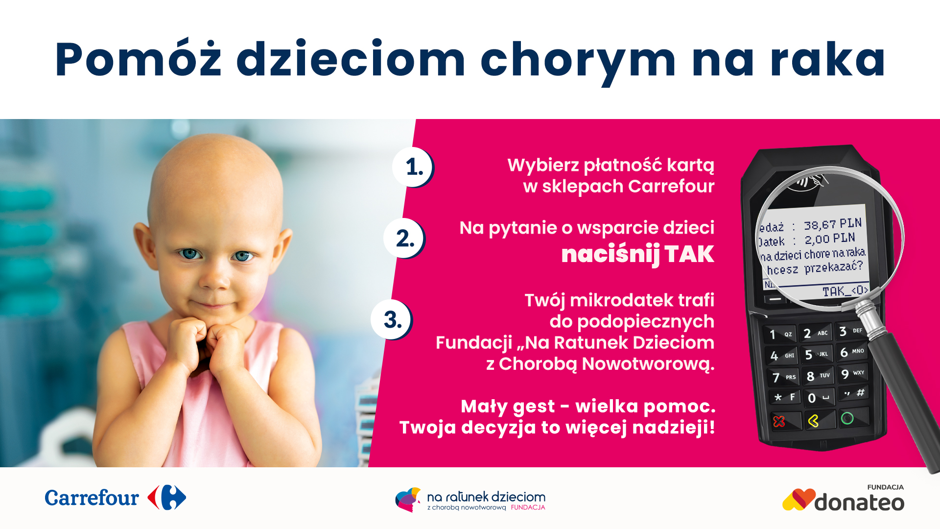 Od 8 do 27 października Fundacja Na Ratunek Dzieciom z Chorobą Nowotworową, Carrefour Polska i Fundacja Donateo łączą siły, aby nieść realną pomoc dzieciom i nastolatkom zmagającym się z chorobą nowotworową. W tym czasie codzienne zakupy w sklepach Carrefour w Polsce mogą stać się źródłem ogromnej nadziei i konkretnego wsparcia.